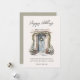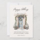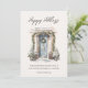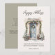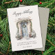 Carte de vœux à plat avec "Joyeuses Fêtes" écriture moderne et porte d'entrée décorée de verdure de Noël à l'aquarelle avec espace supplémentaire au dos pour message personnel.