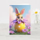 Conçu avec un lapin stylisé et mignon qui regarde à l'extérieur d'un œuf décoré surdimensionné, cette carte est centrée sur de grands yeux sombres scintillants et un petit sourire relevé qui ressemble à un salut timide 🐰. Un ruban jaune vif est posé sur sa tête, et des joues rosées réchauffent son pelage doux de couleur pêche. Le lapin se penche en avant comme s'il partageait un moment privé avec le spectateur, ajoutant une douce et amicale proximité à la scène. Autour de lui, des pétales violets en couches forment une enveloppe en forme de fleur, s'ouvrant comme un bouquet autour du personnage 🌷. En dessous, une forme d'œuf jaune ensoleillé est parsemée de petits pois blancs et repose sur une parcelle soignée d'herbe verte riche. Tout texte de vœux est placé près du haut dans une teinte pastel douce, avec une ligne plus petite placée