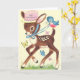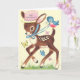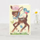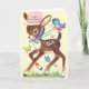 Vintage / Retro Carte de voeux d'anniversaire. Petit cerf doux portant un casquette rose entouré de papillons et d'un oiseau bleu ! Bonjour ! Joyeux anniversaire !
