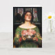 Boutons de rose du YE de rassemblement de John William Waterhouse tandis que carte de voeux du YE mai. Peinture à l'huile sur la toile à partir de 1909. Basé sur le poème de Robert Herrick, les boutons de rose du YE de rassemblement est l'un des ouvrages littéraires les plus fins de peintre du château d'eau anglais de John. La peinture comporte une belle fille dans une robe verte avec la dentelle d'or et la broderie florale. La jeune femme tient une cuvette d'étain fraîchement de roses de rose, de rouge, et blancs de coupe dans des ses mains. Ses cheveux rouge foncé sont attachés avec des perles, et un miroir posté derrière elle indique une fenêtre en verre teinté comportant un manteau des bras et des tulipes pourpres. Un grand cadeau pour des fans de J.W. Waterhouse, art anglais romantique, peinture littéraire, et les Pre-Raphaelites.