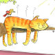 Un chat roux mignon dort sur une branche d'arbre pendant la chaleur de l'été. Un oiseau est perché sur son dos et l'observe.