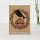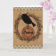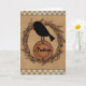 Carte de voeux primitive avec corneille assise sur une assiette avec le mot paix écrit sur l'assiette.s