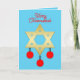 Cette carte de vœux de fêtes combine deux fêtes : Noël et Hanoucca. Le design présente l'étoile de David sur fond bleu avec trois ornements de Noël rouges suspendus. Les mots "Joyeux Chrismukkah" apparaissent en haut. C'est une excellente façon de célébrer deux fêtes à la fois. Copyright Kathy Henis