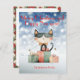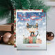 Carte de vœux de Noël - Un cadeau de Noël charmant avec un chat adorable, sur un fond bleu serein. La scène hivernale comprend un arbre magnifiquement décoré et des flocons de neige délicats, ajoutant une touche festive à la saison des fêtes.