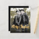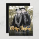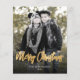 Une carte de vœux de Noël moderne comportant une photo verticale personnalisée. Les mots "Joyeux Noël" apparaissent en écriture dorée fausse feuille, avec votre nom et l'année en dessous en police sans empattement blanche. Remplacez facilement l'image échantillon par votre propre photo préférée. Un écran dégradé noir aide à faire ressortir le texte. Le verso est noir uni.