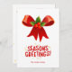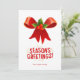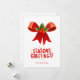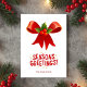 Partagez vos vœux chaleureux pour les fêtes avec cette élégante carte de Noël représentant un ruban rouge surmonté d'un gui festif et de baies rouges vives au centre. En dessous, un message joyeux « Meilleurs vœux pour les fêtes » entouré de scintillements jaune doux, créant un design de vacances classique et joyeux parfait pour les proches. GCard-007