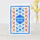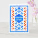 Une carte de voeux de Ramadhan avec un motif islamique traditionnel de trellis dans le blanc sur un arrière - plan bleu et orange. Le texte dans le carreau central ; est dans le blanc et lit, "Ramadhan Kareem". Conception peinte à la main dans les aquarelles par Judy Adamson. L'intérieur est laissé vide pour votre propre message.