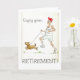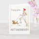Une carte de voeux de "retraite" avec un stylo peint à la main et le lavage conçoivent par Judy Adamson d'un homme plus âgé pulsant avec son chien. Sur sa chemise est le slogan, "refait l'installation électrique, non retiré !" et le texte sur la carte lit, "apprécient votre retraite". Masquez l'intérieur pour votre propre message.