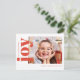 C'est une carte de vœux rouge et blanche lumineuse et simple qui présente une photo unique minimaliste associée au mot « joy » (joie) dans une police serif classique élégante et grasse.