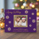 Partagez la joie de Noël avec cette superbe carte de vœux familiale. Le fond violet foncé est magnifiquement rehaussé de délicats flocons de neige dorés, créant un design festif et sophistiqué. Votre précieuse photo de famille est mise en valeur, encadrée par une bordure dorée étincelante, créant un point de mire qui irradie de chaleur et d'amour. Personnalisez la carte avec le nom de votre famille et les noms de chaque membre pour la rendre unique. L'intérieur de la carte comporte un message de Noël sincère en lettrage doré élégant, adressant des vœux chaleureux pour une période des fêtes remplie de bonheur et de gaieté. Cette carte plate personnalisable est un moyen idéal de se connecter avec les proches pendant la période la plus merveilleuse de l'année.