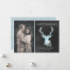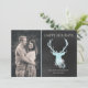 Carte de voeux stylée, rustique, plate faite dans un style de tableau noir gris, à droite, et une photo personnalisée sur le côté gauche. Les graphiques d'une tête de cerf d'aquamarine, aux parties scintillant d'aqua ressemblant à des bois, ornent le côté tableau noir de la carte. De jolis flocons de neige blancs et de couleur aquamarine ornent le fond du cerf. Personnalisez les champs de texte blanc pour répondre à vos besoins en cartes de Noël.