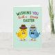 Conçue avec deux personnages d'oiseaux stylisés se faisant face, la carte donne un ton amical et légèrement romantique grâce à leurs poses proches et symétriques ainsi qu'à leurs joues rosées 🌷. Un fond vert menthe doux maintient la scène calme tout en faisant ressortir les formes simples et les couleurs plates. À gauche, un oiseau jaune doré porte un fedora marron avec un petit bandeau violet et un nœud papillon violet assorti, ce qui lui donne une apparence élégante. À droite, un oiseau bleu ciel porte un fedora gris avec un bandeau sombre et un nœud papillon sombre, faisant écho à son compagnon comme un duo coordonné 🐇. Leurs petits yeux ronds et leur léger rougissement les font paraître affectueusement attentifs, comme s'ils partageaient une plaisanterie silencieuse. En haut, le texte de vœux est disposé sur quelques lignes, mélangeant des lettrages verts, rouges chauds et violets pour que les mots soient vivants sans être bruyants. Les lettres utilisent des styles et