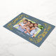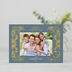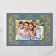 Cette carte de Noël horizontale bleu poussiéreux présente une élégante végétation hivernale en feuille d'or qui encadre la photo. L'arrière offre 2 photos carrés supplémentaires et du texte personnalisé pour un message personnel.