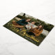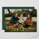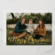 Carte de vacances élégante avec votre photo horizontale sur le devant avec "Joyeux Noël" affichée dans une superposition en gras feuille d'or. Personnalisez le devant de la carte photo de Noël avec votre nom de famille et l'année. La carte de vacances en feuille s'inverse pour afficher une photo supplémentaire encadrée en blanc avec un arrière - plan vert foncé avec des points blancs subtils.