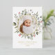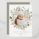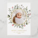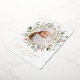 Elégante carte de vacances avec votre photo encerclée d'un cadre de feuille d'or avec des baies vierges rouges, des baies de neige, des feuilles d'eucalyptus et un feuillage vert de sauge luxuriant. Personnalisez l'avant de la carte photo botanique de Noël avec un accueil personnalisé, votre nom de famille et l'année en lettres rouges. La carte de Noël en papier d'aluminium s'inverse pour afficher votre message personnalisé en lettres blanches avec un arrière - plan sage foncé.