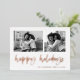 Ce carte photo de vacances familial blanc classique est doté d'une typographie décontractée et moderne en feuille d'or rose, qui dit "happy holiday", avec une grille photo à l'avant pour un design de vacances élégant, moderne et minimaliste. Le dos de la carte est noir.