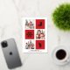 JOY Elegant Gold Snowflakes Script moderne sur la couleur rouge festive 3 Photo Collage Real Foil Holiday Card. Envoyez des voeux de vacances à vos proches avec cette carte de vacances moderne et festive. Tous les textes sont pré-arrangés pour que vous personnalisiez facilement et rapidement avec vos propres détails. Joyeuses fêtes !
