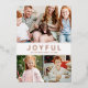 Ce design moderne et minimaliste de cartes de collage photo de Noël présente un libellé "JOYFUL" en lettres sans serif simples et audacieuses, imprimées en papier or rose. Personnalisez avec vos trois photos préférées (plus photo bonus au dos), votre nom de famille et l'année. Le libellé de bonus supplémentaire est inclus au verso. Parfait pour inclure vos souhaits de vacances, les noms des membres de la famille, la faire-part d'un nouveau chiot chien, ou d'autres nouvelles!