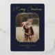 Répandez des réjouissances de vacances avec cette élégante carte de Noël en or réel en bleu foncé festif avec "Joyeux Noël", un cadre doré autour de votre image personnalisée, police de calligraphie de script élégant et votre nom de famille. Customisez cette carte de vacances moderne avec votre photo de choix. La couleur de fond avec le motif de flocon de neige est bleue, mais toutes les couleurs de ce design peuvent être changées dans l'outil de conception si vous voulez.