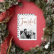 Carte de vacances en feuille moderne avec un script en feuille d'or rose "Joyful" écrit à la main avec un arrière - plan blanc. Personnalisez l'avant de la carte en ajoutant votre photo horizontale préférée et votre nom. Au verso de la carte, un motif de Noël moderne noir et blanc.