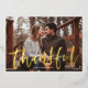 Carte Thanksgiving moderne avec votre photo horizontale avec "Thankful" affichée en écriture manuscrite en feuille d'or avec votre nom de famille affiché ci-dessous. La feuille Thanksgiving est retournée pour présenter un motif de feuillage blanc avec un arrière - plan mauve de baies.