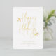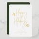 Joyeuses Fêtes, scénario simplement festif avec accents de feuillage, typographie à feuille d'or véritable. Cadre photo carré unique avec espace de modèle pour votre message de vacances personnel au dos avec fond vert foncé.