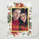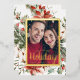 Photo Script Foil Carte de vacances. Cet élégant carte photo Holiday dispose d'un cadre magnifique de verdure aquarelle peinte à la main, de fleurs et de baies avec un cadre en or réel et un script élégant. Le dos comprend la même illustration avec une deuxième photo et un texte pour personnaliser votre message. Trouvez les articles correspondants dans la collection de Poinsettia de Noël.