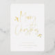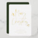 Joyeux Noël, script simplement festif avec accents de feuillage, typographie en véritable feuille d'or. Cadre photo carré unique avec espace de modèle pour votre message de vacances personnel au dos sur fond vert foncé.