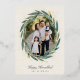 Envoyez vos salutations Hanoukka à vos amis et votre famille dans le style chic avec nos élégants cartes photos. Votre image préférée, orientée vers la verticale ou vers le portrait, est encadrée par une couronne de laurier ovale de feuilles d'eucalyptus vert à l'aquarelle sur un arrière - plan d'ivoire chaud accentué d'étoiles de feuille d'or. Personnalisez avec votre salutation de vacances personnalisée et les noms sous.
