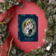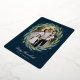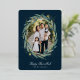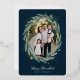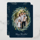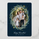 Envoyez vos salutations Hanoukka à vos amis et votre famille dans le style chic avec nos élégants cartes photos. Votre image préférée, orientée vers la verticale ou le portrait, est encadrée par une couronne de laurier ovale d'eucalyptus vert à l'aquarelle sur un arrière - plan bleu marine foncé agrémenté d'étoiles en feuille d'or. Personnalisez avec votre salutation de vacances personnalisée et les noms sous.