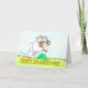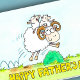 Cette mignonne carte de fête des pères dessinée dans un style de dessin animé montre un bélier sautant au-dessus d'un buisson vert sur un pré, devant un ciel bleu. Le mouton mâle a deux petits agneaux sur le dos qui sont clairement en train de s'amuser avec leur père. Sous eux, sur le gras, les mots "Fête des pères heureuse" sont écrits en caractères jaunes gras.