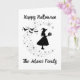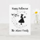 Une silhouette de sorcière gracieuse dans une robe fluide tient une citrouille-lanterne souriante tandis qu'un tourbillon d'étoiles scintillantes se courbe en croissant autour d'elle et qu'une petite volée de chauves-souris dérive au-dessus. Illustrations minimalistes noires sur fond blanc pour une ambiance élégante et sorcière—parfaite pour les vœux d'Halloween, les anniversaires d'octobre ou les invitations à des fêtes. Personnalisez le recto et l'intérieur avec votre message, vos noms et votre date.