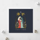 Cette carte de Noël présente une illustration de la sainte famille encadrée par une paire de palmiers, l'étoile de Bethléem et des lys blancs. Ce design intime capture le miracle et l'intimité de la naissance de Jésus.