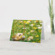 Joyeuse carte de voeux de Pâques avec corbeille d'oeufs de Pâques dorés dans une herbe verte remplie de beaux pandelions jaunes et marguerites blanches.