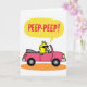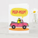 Cette carte de vœux représente un petit personnage d'oiseau jaune portant des lunettes de soleil foncées et conduisant une voiture décapotable rose bubble-gum, dégageant une confiance amicale et flirteuse comme s'il passait en voiture pour dire bonjour 🐇. L'oiseau est assis légèrement sur la droite, les mains sur le volant, avec une inclinaison désinvolte qui suggère qu'il se pavane pour quelqu'un juste hors champ. La voiture est dessinée avec des roues épaisses ressemblant à des engrenages et des contours noirs épais, ce qui garde l'apparence simple et graphique. Au-dessus du conducteur, une bulle de parole jaune arrondie flotte près du haut et ajoute une atmosphère bavarde et conviviale, comme si l'oiseau appelait un ami. À l'intérieur de la bulle, le texte « PEEP-PEEP ! » apparaît en rouge vif, en grandes lettres et centré, de sorte qu'il ressemble à un coup de klaxon joyeux. Le fond reste blanc uni, ce qui fait ressortir clairement le jaune, le rose et le rouge, les contours noirs gard