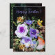 Trouvez cette jolie carte de vacances orientale avec des roses et des fleurs bleu violet sur un fond noir avec des nuances de rose et de vert.