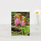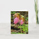 Carte de voeux pliée avec photo d'orchidées glissantes de dame rose en milieu forestier. Message vide.