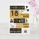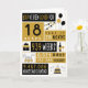 Carte de voeux de 18e anniversaire conçue en or et noir pour votre ami ou famille qui a 18e anniversaire avec ballons, bouts, vin, boîte cadeau, gâteau, jours, mois, minutes, texte de semaines.