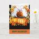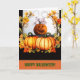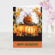 Une carte de vœux Halloween avec un citrouille drôle entouré de feuilles et de fleurs d'automne.