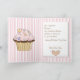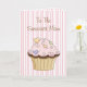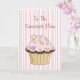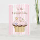 Carte de voeux pour la fête des mères douces, faite en rayures roses et blanches. L'illustration graphique d'un cupcake au chocolat fantaisiste, avec givre rose et arrosage cardiaque, orne l'avant de la carte. Texte Brown du script : To the Sweetest Mom. Décoré comme à l'extérieur, l'intérieur a une zone de texte blanc, avec un texte de texte brun saluant pour maman. Tout le texte est prêt pour vous à personnaliser pour votre mère spéciale.