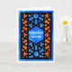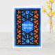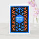 Carte de voeux Ramadhan avec un motif traditionnel en treillis islamique en noir sur un arrière - plan bleu et orange. Le texte dans le volet central est en blanc et dit, 'Ramadhan Kareem'. Design peint à la main en aquarelles par Judy Adamson. L'intérieur est laissé vide pour votre propre message.