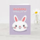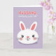 Cette carte présente une tête de lapin blanc stylisée reposant dans la partie inférieure du dessin, sur un fond lavande doux 🌷. Le lapin a des oreilles dressées avec des détails intérieurs roses, de petits yeux noirs, un petit nez rose et des joues rondes et rosées qui lui donnent un air tendre et amical, comme s'il se penchait pour un salut doux. Juste au-dessus du lapin, un message sur deux lignes est placé dans la moitié supérieure, avec la première ligne en lettrage corail et la deuxième ligne en lettrage blanc pour un contraste doux. Les formes arrondies des lettres sont douces et affectueuses, faisant écho à l'expression calme du lapin et ajoutant un ton chaleureux et intime 🐰. De fines lignes de moustaches et une petite bouche incurvée ajoutent une touche de chaleur, comme si le lapin souriait tranquillement à quelqu'un de spécial. Une ombre légère sous la tête de lapin l'aide à se détacher de l'arrière-plan sans ajouter de contours d
