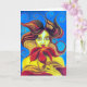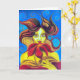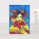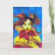 Cette carte de voeux colorée et unique célèbre la fraîcheur de l'été. La carte présente une femme tenant une fleur rouge vif tandis que ses cheveux soufflent dans la brise. Un ciel bleu tropical l'entoure. Parfait pour envoyer des salutations chaudes - ou romantiques! Vide à l'intérieur.
