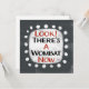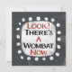 Un dessin typographique irrévérencieusement bizarre qui dit "Regarde ! Il y a A Wombat Now". Il présente du texte noir et rouge sur un rectangle blanc avec des points blancs amusants et amusants qui l'entourent, le tout sur un arrière - plan gris.