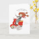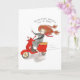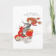Une carte de voyage de fève tenant le premier rôle la chapelle Smith une fille mignonne et rousse qui voyage le globe conduisant un vespa ou une moto rouge avec un siège jaune, une tasse de café dans sa main droite avec la vapeur se levant de elle, alors que sa main gauche conduit le vespa, les lunettes de soleil de port et une écharpe rouge soufflant derrière elle dans le vent pendant qu'elle conduit le long sur ses voyages autour du monde et du globe. La chapelle indique que "ces personnes savent sure voyager." Un cadeau parfait de voyage de fève pour n'importe qui allant un voyage à une ville, pays, n'importe où dans le monde ou dans le monde entier.
