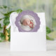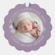 Modern keepsake baby's first Christmas personalize paper ornament in curve letters and line art of snowflakes overlaying a dusty purple with your favorite photo.