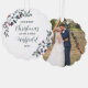 Premier Noël en tant que décoration de Noël Mr & Mrs personnalisée avec votre photo mariage d'un côté et de l'autre votre nom de famille partagé avec l'année encadrée par de jolis bouquets de fleurs de Noël en blanc, rouge, bleu et vert.