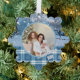Cette carte personnalisable en papier flocon de Noël est une façon délicieuse de répandre la joie des fêtes. Parfait pour votre sapin de Noël, votre miroir de voiture, ou comme une fête, il présente votre photo chère au centre. Le dessus présente une scène de campagne enneigée sereine, tandis que le fond ajoute un motif confortable en plaid bleu pour une touche amusante. Cette carte de décoration en papier flocon de neige laissera une impression durable à ceux qui la recevront. Vous pouvez choisir de garder le sentiment réfléchi sur le dos ou d'ajouter votre message. N'oubliez pas d'inclure votre nom ou votre nom de famille, et assurez-vous que l'année est correcte.