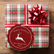 Un renne blanc élégant saute sous Joyeux Noël en écriture blanche. Personnalisez ces étiquettes cadeau de vacances rouges votre nom de famille en dessous pour de beaux cadeaux personnalisés pour les invités de fête.