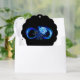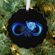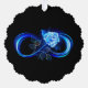 Luminous infinity symbol with glowing, beautiful, lushly blooming rose made of blue flames on black background.